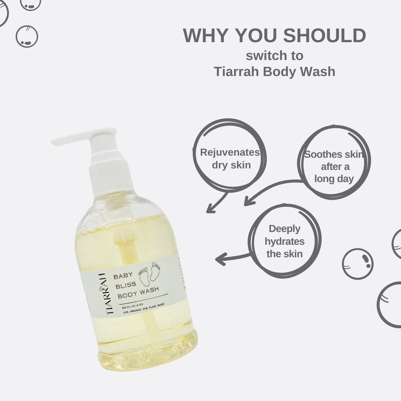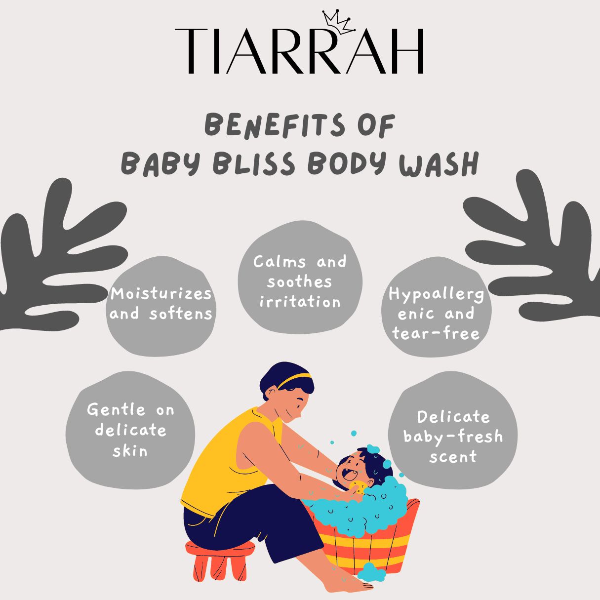 Tiarrah Baby Bliss Body Wash is a gentle and caring formula specially designed for delicate baby skin. Enriched with nourishing ingredients, this body wash provides a tender cleanse, leaving the skin feeling soft and fresh. The mild and soothing properties make it ideal for your little one's bath time, ensuring a comforting and nurturing experience. Embrace the gentle care of Baby Bliss Body Wash for your baby's sensitive skin.