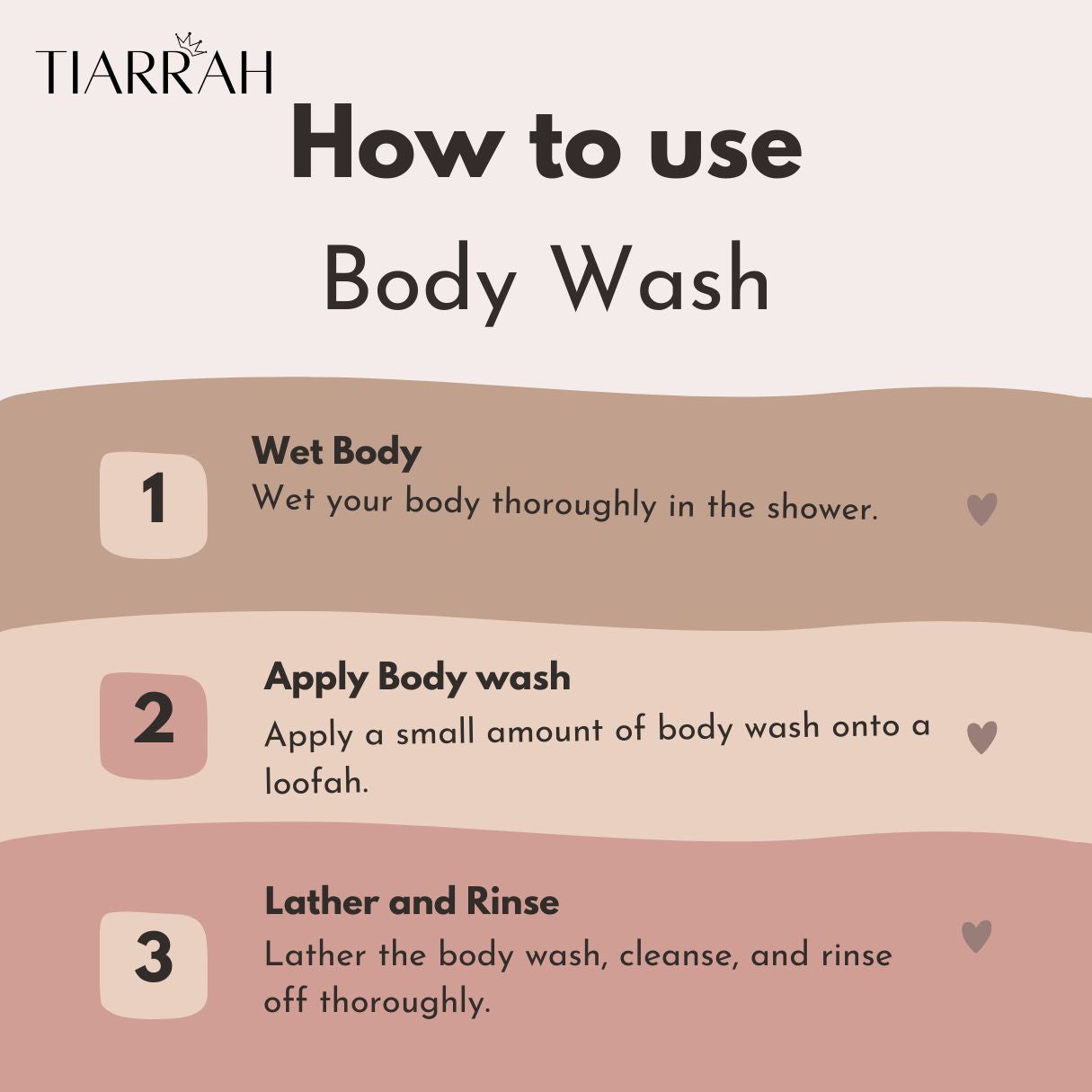 Soak a loofah in water and pour a coin sized amount of body wash. Work into a lather and rub onto moist skin. Rinse it off with water and towel dry